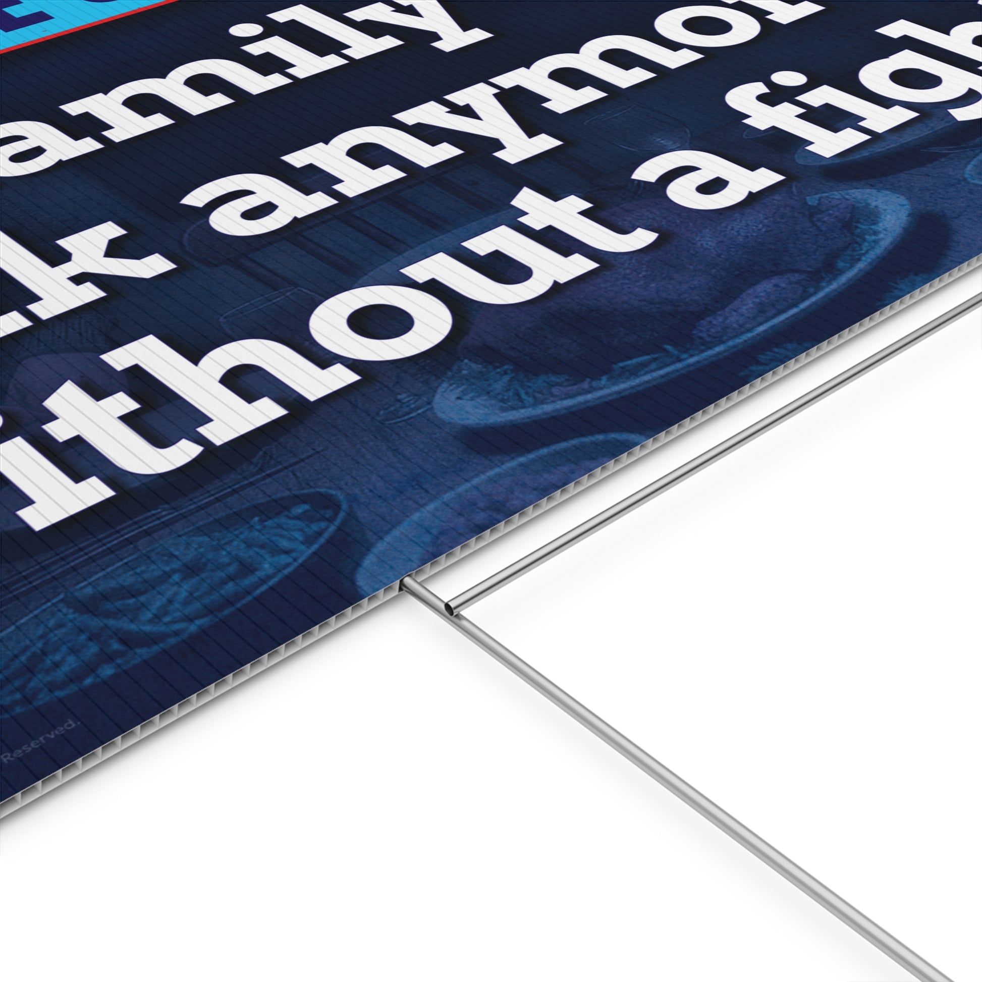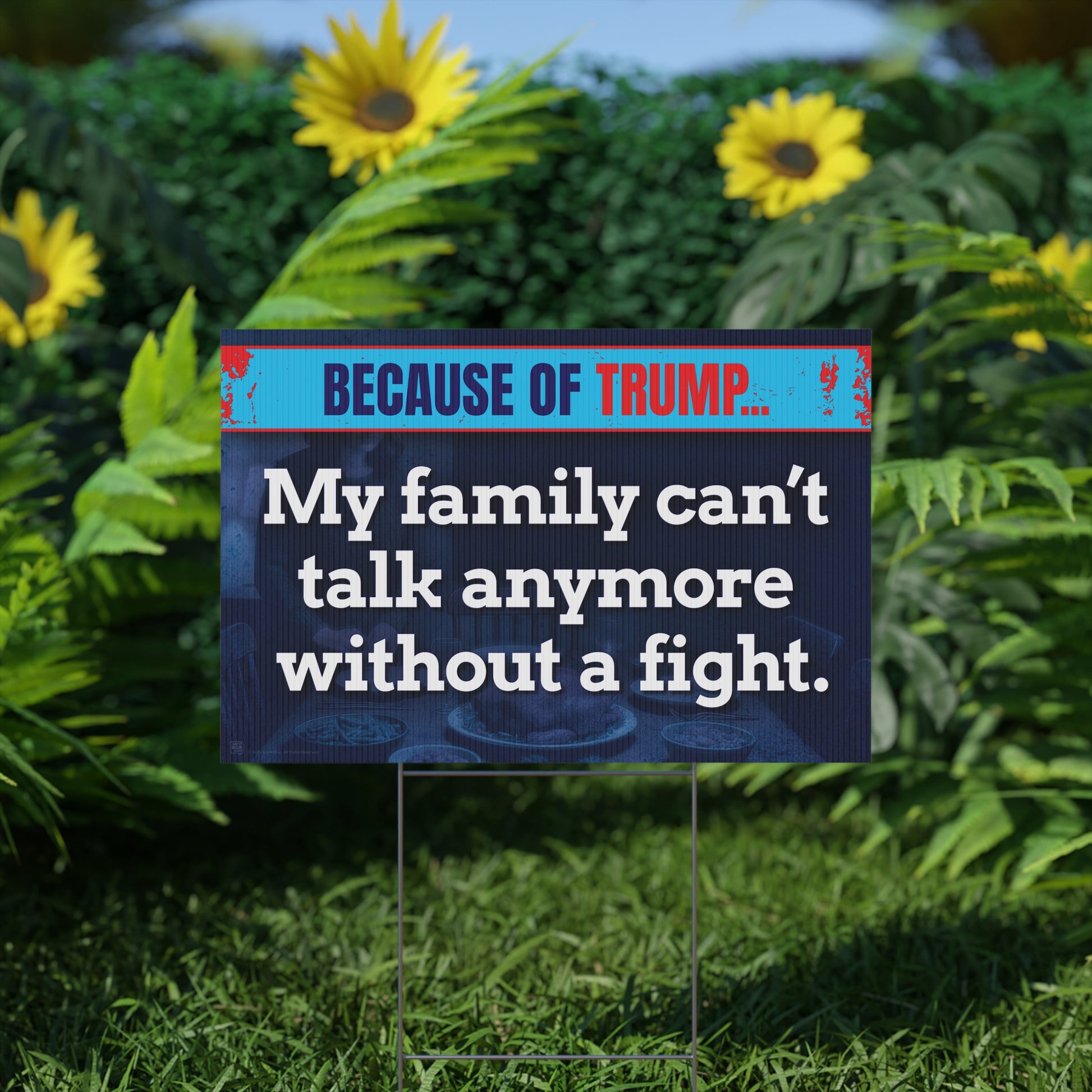 It’s not just about policy anymore—it’s personal. Trump didn’t just divide the country; he divided families. This emotionally charged yard sign gives voice to the silent pain so many Americans carry: "Because of Trump... my family can’t talk anymore without a fight."