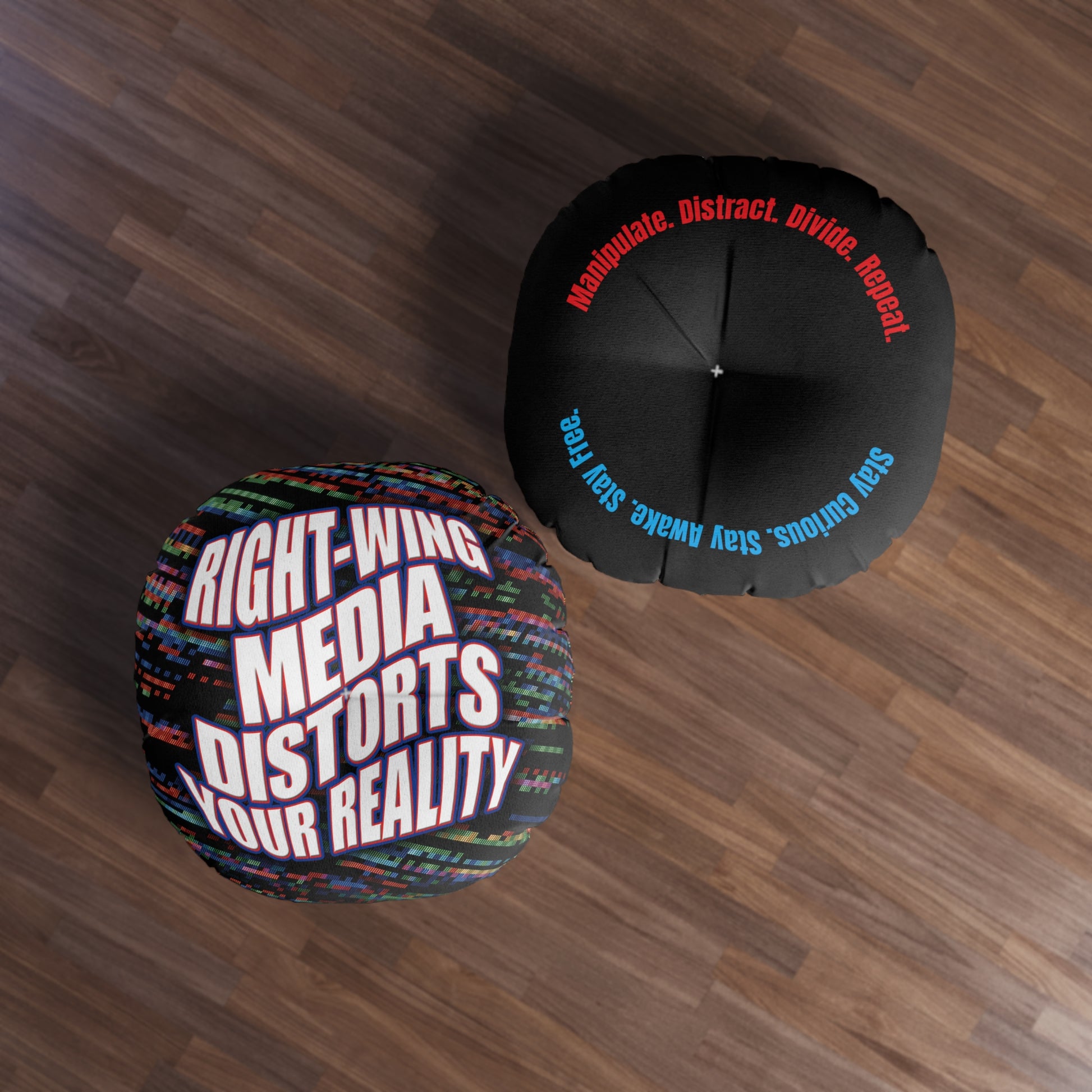 Say it with your seat: “RIGHT-WING MEDIA DISTORTS YOUR REALITY.” This oversized tufted floor pillow doesn’t whisper—it shouts. The front blasts a warped truth bomb in vivid color, while the back keeps the pressure on with a circular mantra: “Manipulate. Distract. Divide. Repeat.” in red, followed by “Stay Curious. Stay Awake. Stay Free.” in blue.