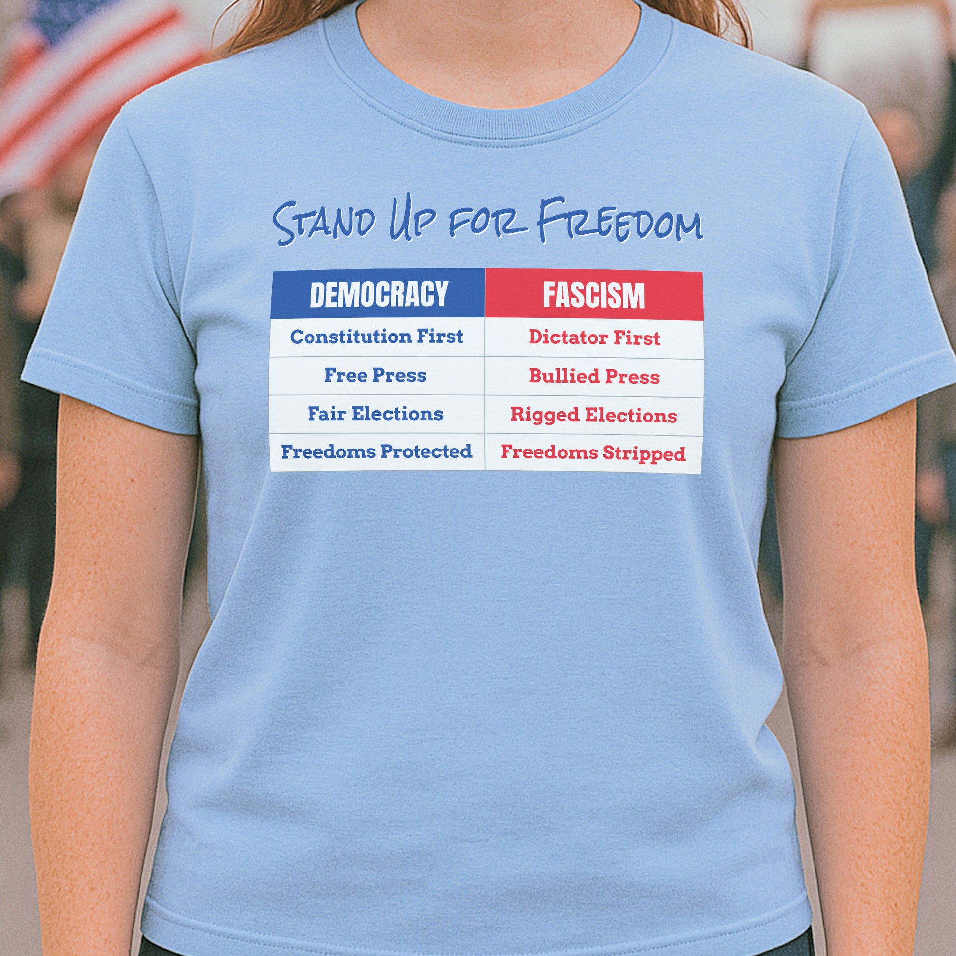 Sometimes the clearest message is a side-by-side comparison. This design lays out democracy versus fascism in simple terms anyone can understand. Wear it to protests or teach-ins to start conversations that matter.