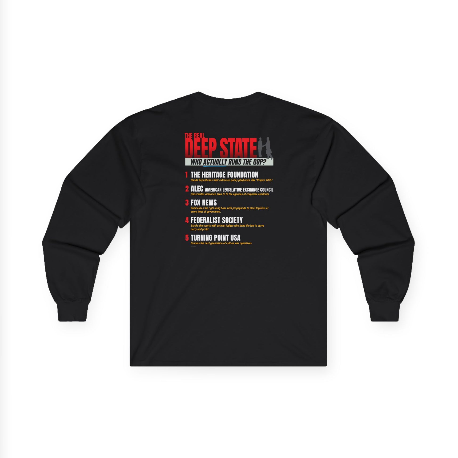 This powerful long sleeve tee calls out the true unelected power players shaping American policy—from think tanks to media empires. The front graphic plants the seed. The back names names.