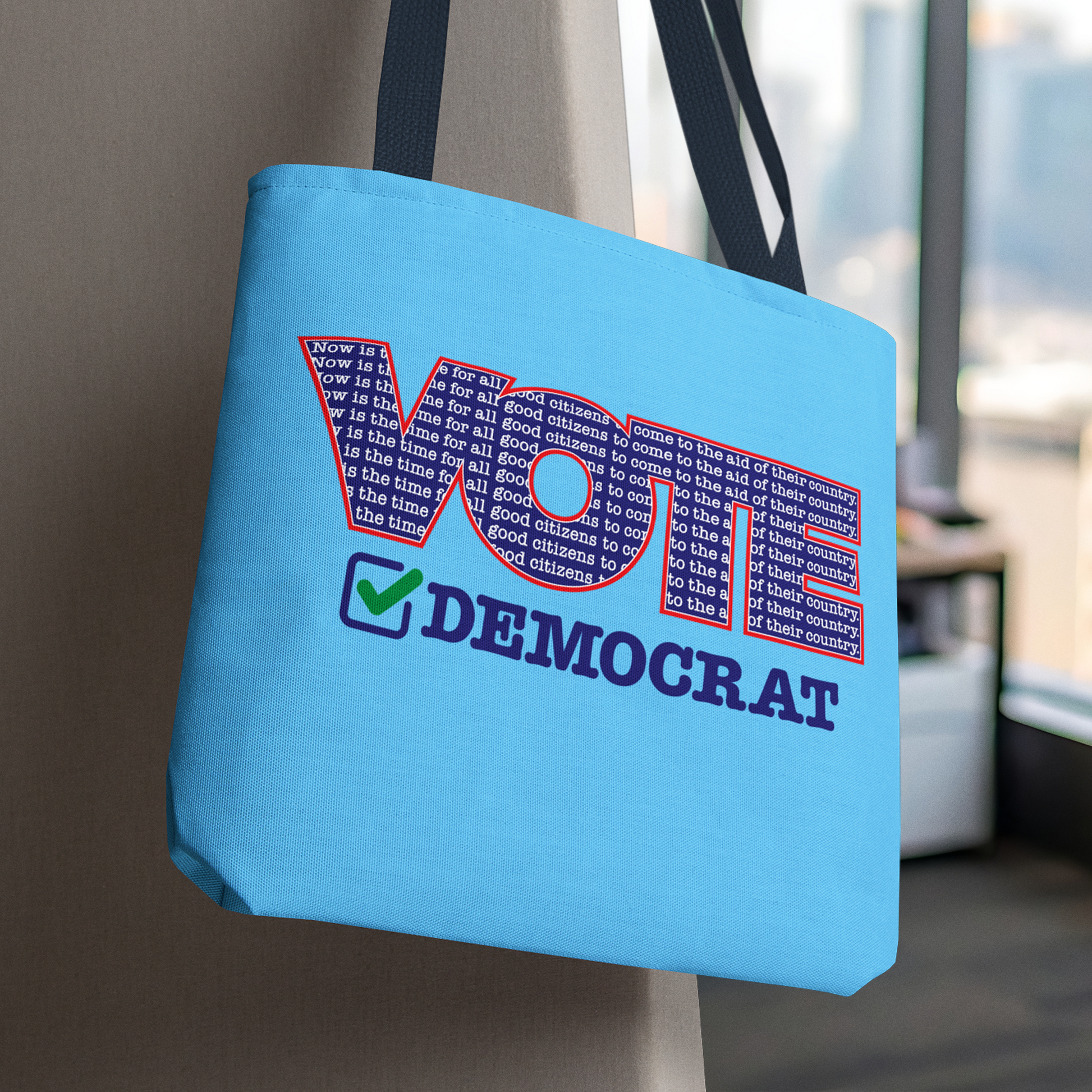 This striking tote bag turns that timeless call to action into a bold, visual statement. With the word “VOTE” filled by repeating lines of this historic phrase and a checkmark boldly stamped over “DEMOCRAT,” this design is more than graphic—it’s a call to civic courage.